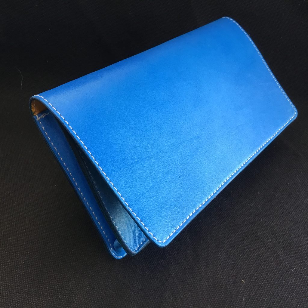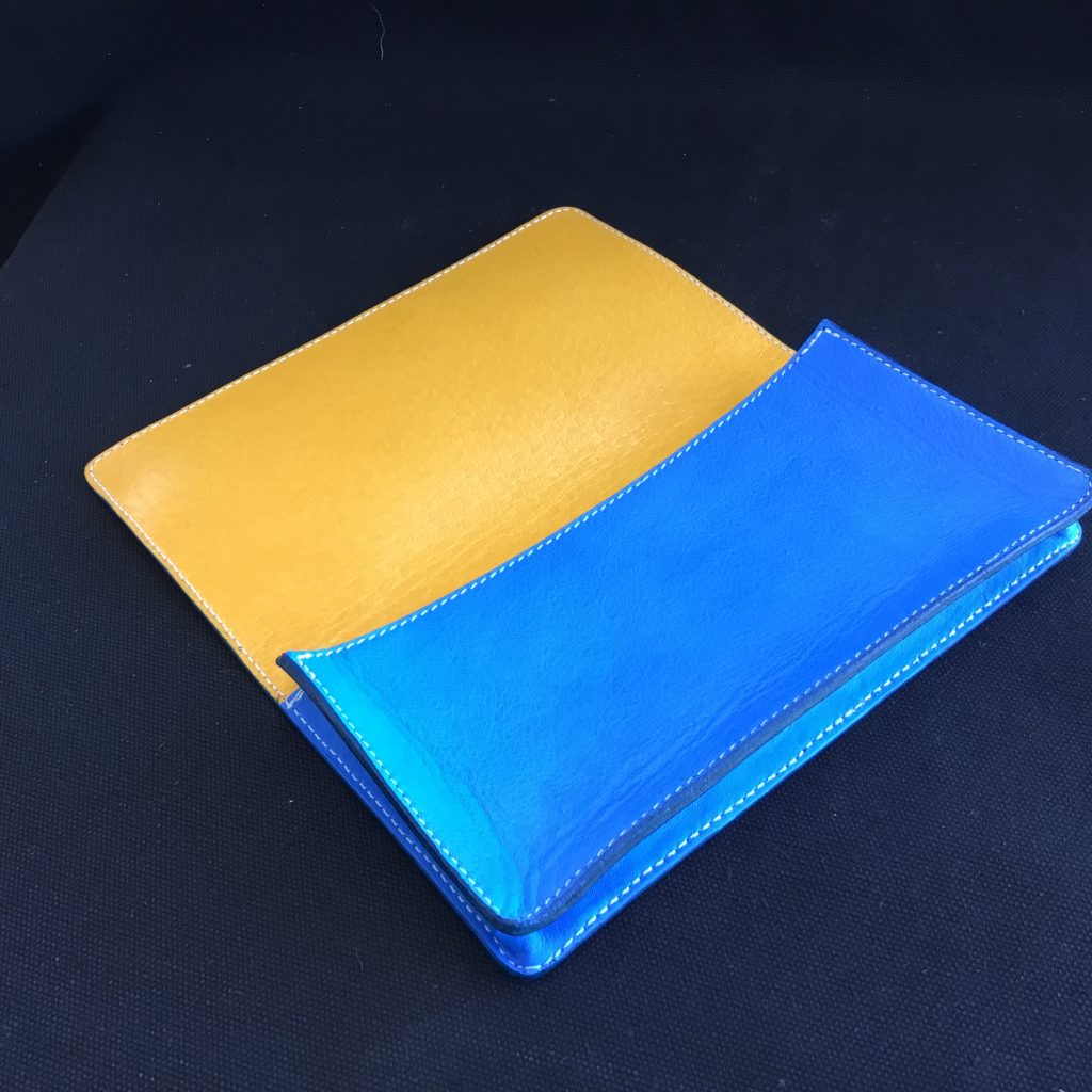 財布は「お札を多めに入れたい」というご希望でしたので、マチは太くして、裏貼りにはアメ豚を使用しました。