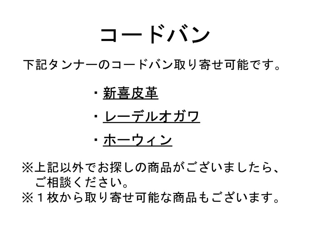 店内ポップ(コードバン) その他 2025.01.31 皮革工芸材料店「かわのすけ」です。店舗内に掲示しているお得情報満載の店内ポップをご紹介します。 上記の内容は予告なく変更する場合がありますのでご了承ください More from my siteキーリング(KW25034)ブックカバー(KW25033)バッグ(KW25032)スマホポーチ(KW25031)ロングウォレット(KW25030)ペンスタンド(KW25029)